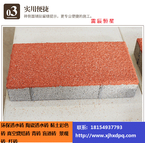 彩色透水磚:透水磚與傳統(tǒng)的彩色路面磚不同,它呈多孔、蜂窩狀結(jié)構(gòu),本身有自然積存、自然滲透、自然凈化功能。它能有效的解決城市熱島效應(yīng)、除塵降噪,是海綿城市建設(shè)不可缺少的路面材料。聯(lián)系熱線18154927793李經(jīng)理或者0991-6867420.