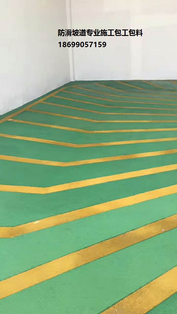 根據(jù)要求將混合好的止滑層材料先用鋸齒鏝刀批刮一遍在抗壓層上,然后再?lài)娡恳槐椋纬梢欢ê穸缺砻娲植诘牟噬珬l形止滑帶。